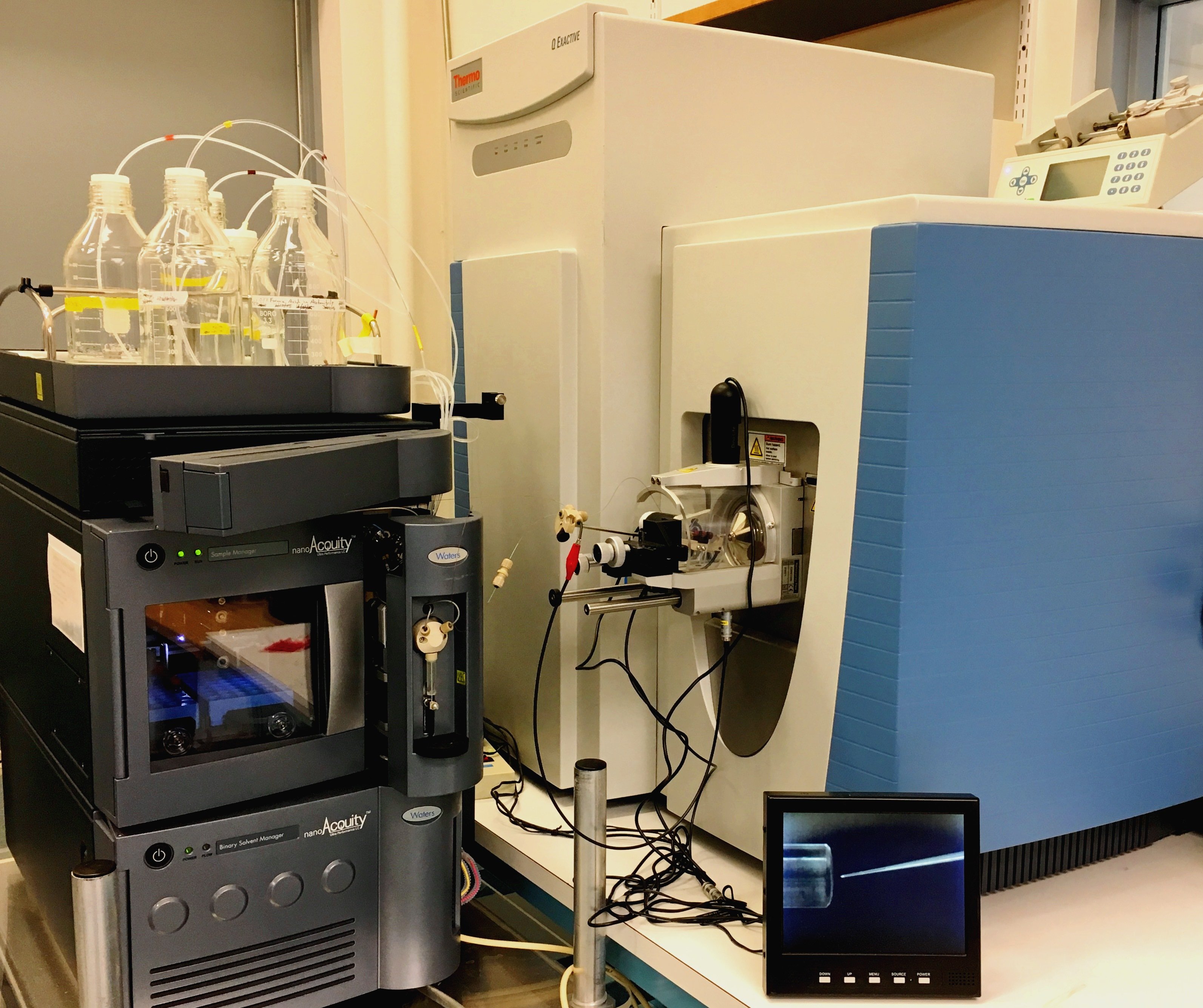 Thermo Scientific Q Exactive with Waters NanoAcquity UPLC ~proteomics~ A quadrupole-Orbitrap hybrid mass spectrometer employing HCD fragmentation used for proteomics applications. Analysis of simple and complex protein digests. Ideal for peptide mapping, protein ID or label-free (peptide peak area) quantitative workflows. |