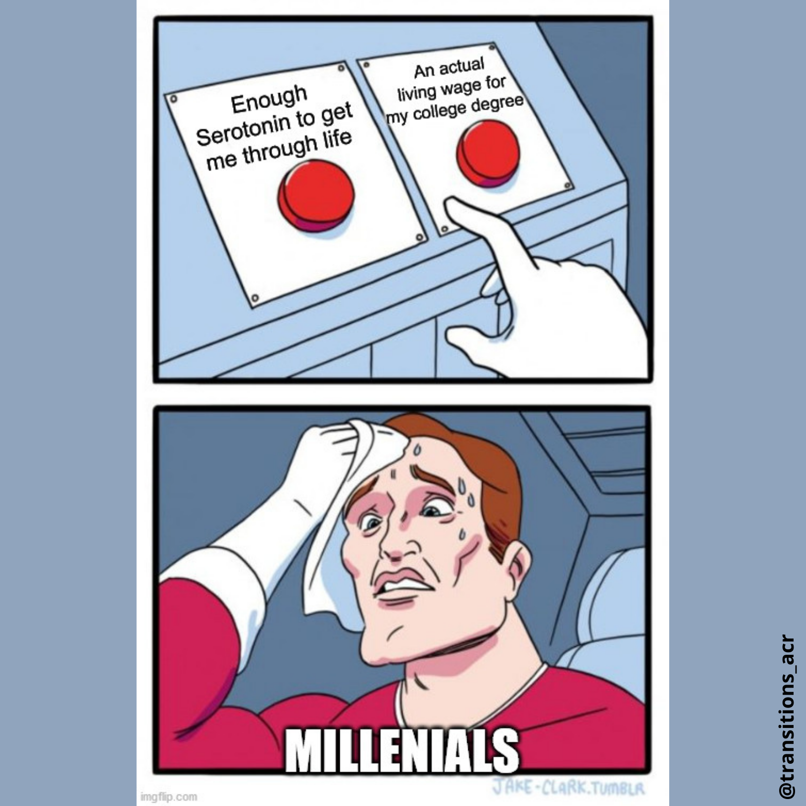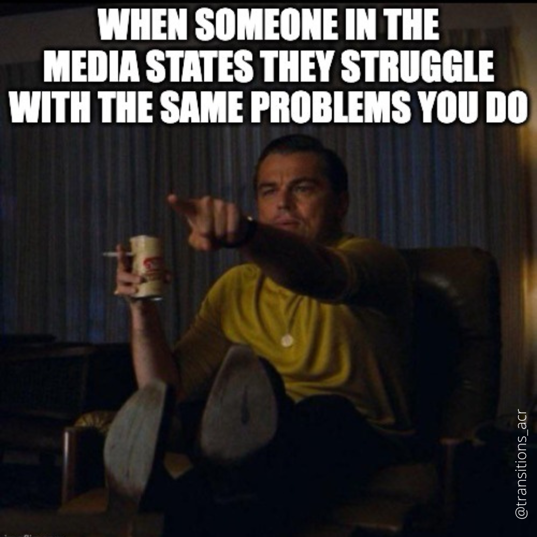 One of our youth led Learning & Working RRTC’s knowledge translation projects is developing memes that are relevant to youth and young adults living with mental health conditions. Memes use popular cultural images and simple language to convey meaningful content on social media. Started in 2019, our memes are developed in close collaboration with our National Youth Advisory Board (YAB) and posted on the Transitions to Adulthood Center for Research’s social media.