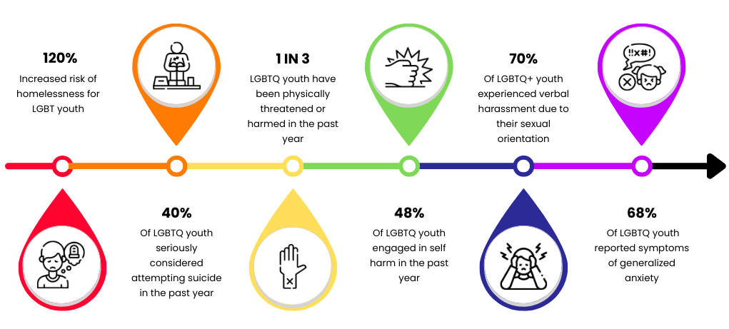 The above statistics* illustrate the heightened risks LGBTQIA+ youth experiencing adverse life events and symptoms of mental health conditions because of stigma and discrimination.5-7