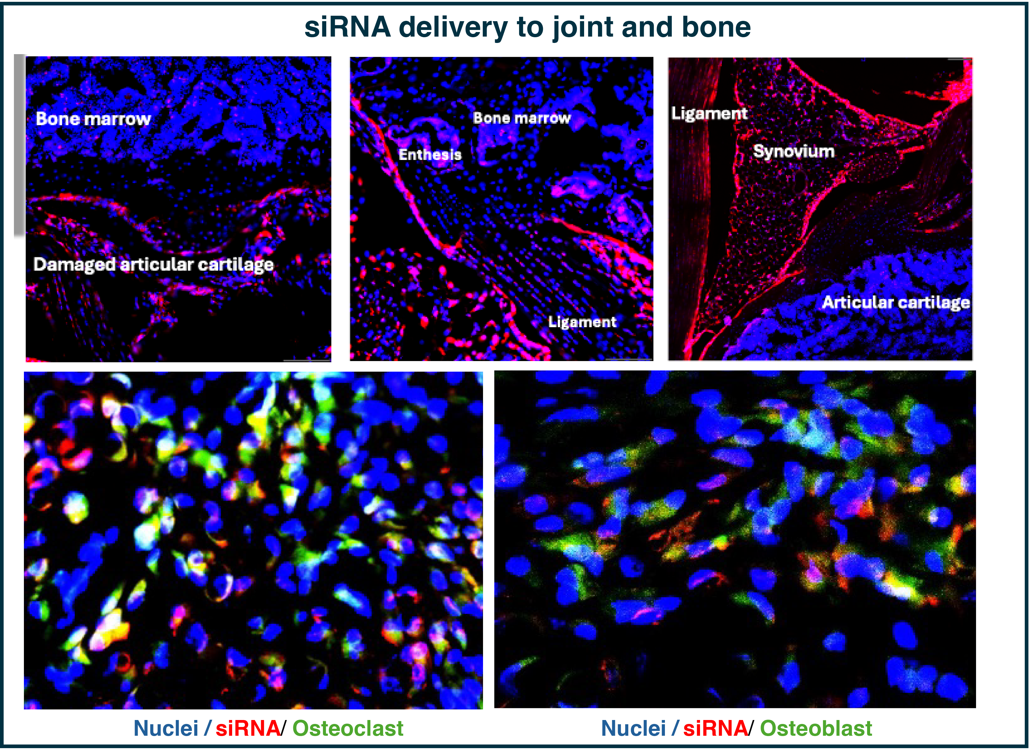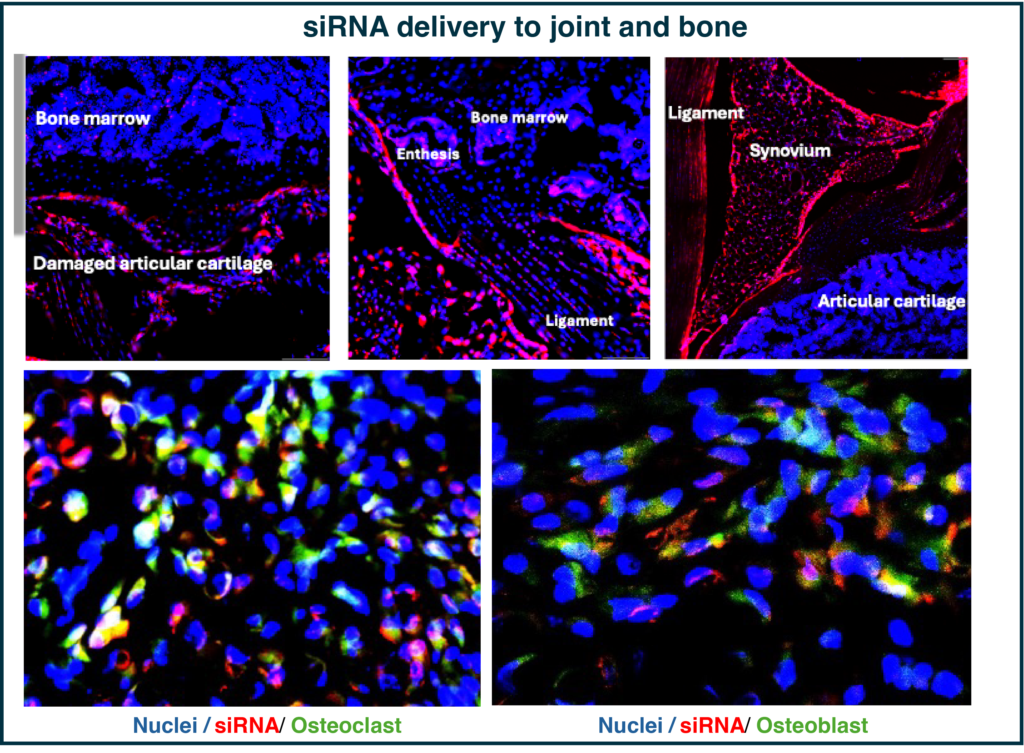 Also in collaboration with the Jae-Hyuck Shim Lab, our group is working to develop combinatorial treatments for rheumatoid arthritis and osteoarthritis that target both inflammatory signals as well as genes involved in bone growth and degradation. This work involves identifying siRNAs against new targets relevant in these conditions and optimizing the multivalent siRNA chemical architecture for delivery to bone, joint, and sites of inflammation.