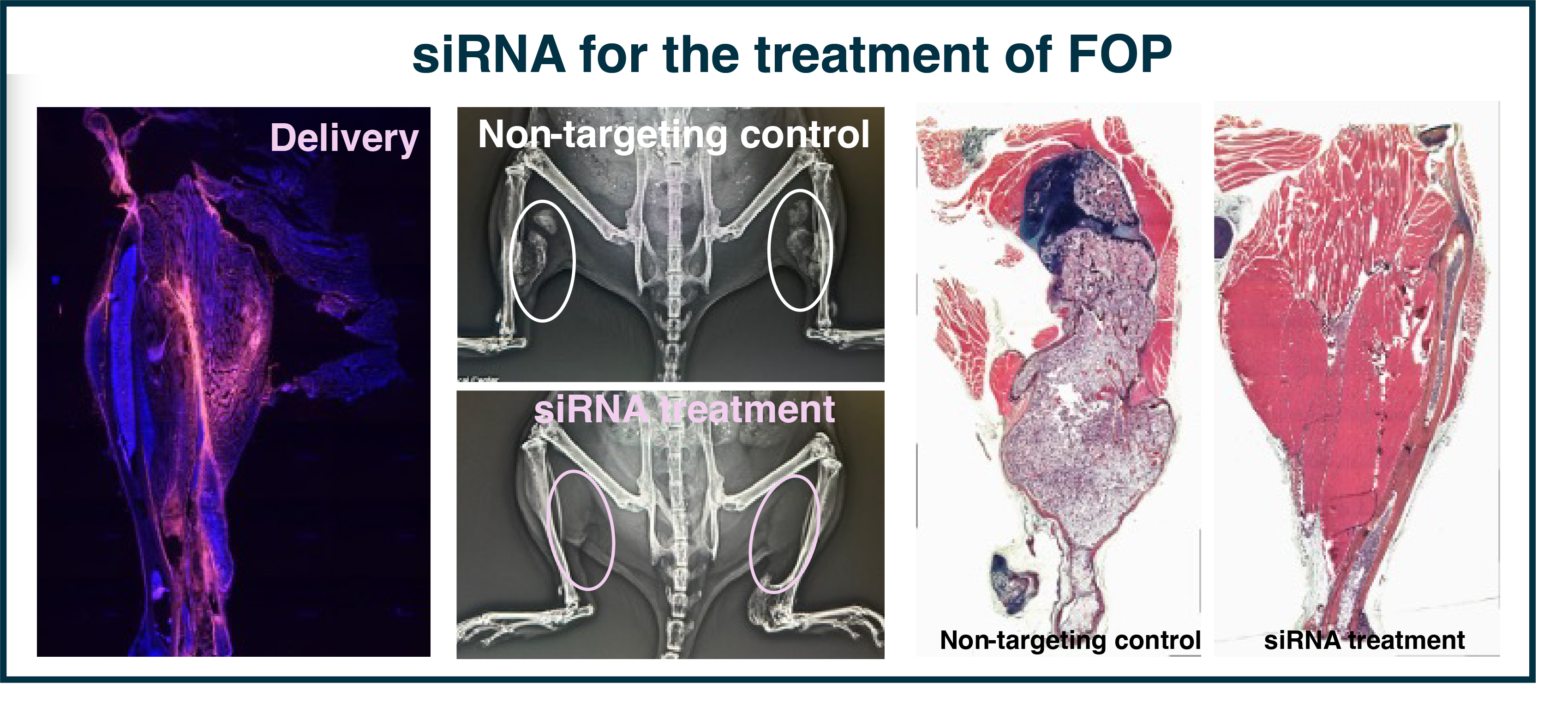 Our lab is also very interested in applying this technology to diseases of muscle and connective tissue. We are collaborating with the Jae-Hyuck Shim Lab in the Department of Genetic and Cellular Medicine to develop multi-functional siRNAs to suppress trauma-induced heterotopic ossification in fibrodysplasia ossificans progressiva (FOP). FOP is a devastating rare disease caused by an autosomal dominant mutation in ACVR1. Infividuals with this mutation experience aberrant bone growth following injury and inflammation to the muscle and connective tissue. We have developed a combinatorial siRNA treatment targeting the mutant ACVR1 receptor and an inflammatory target that significantly reduce bone growth after injury in a mouse model of FOP.