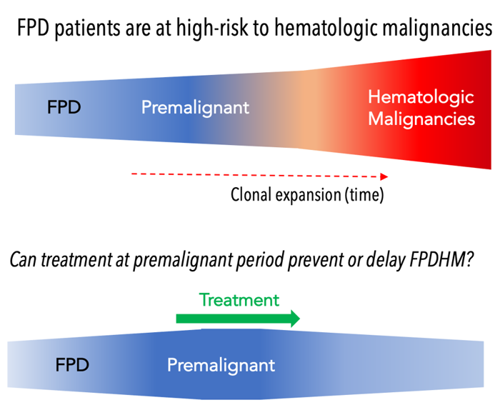 The mechanisms by which RUNX1 mutations cause expansion of malignant clones and HM are not well understood. Importantly, effective therapies for FPDHM are lacking. Since FPD patients can live many years in a preleukemic period, there is a unique opportunity to design FPDHM treatments.