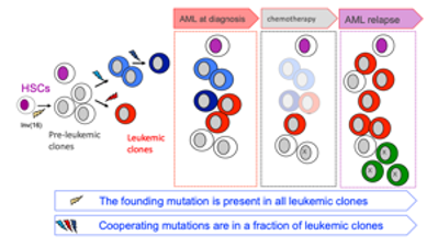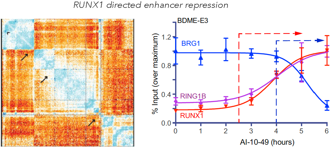 A longstanding interest in the laboratory has been to understand the molecular aspects of how mutations in the hematopoietic stem cells drive acute myeloid leukemia (AML). We aim to develop novel therapeutics that can be brought to the clinic. With focus on the leukemia fusion protein CBFß-SMMHC, which results from an inversion in chromosome 16, we have established that the fusion protein drives leukemia development, and that the leukemia stem cells remain dependent on its function to expand. Functionally, we have established that expression of the CBFß-SMMHC in hematopoietic stem cells creates a preleukemic progenitors that lead to AML in cooperation with other mutations (Castilla et al., Cell 1996, Nat Genet 1999). These mutations enhance leukemic stem cells activity in mice (Kuo et al., Cancer Cell 2006; Xue et al., Blood 2014). We have shown that CBFß-SMMHC is critical for maintenance of AML by regulating expression of oncoproteins such as MYC, and its repression triggers apoptosis (Pulikkan et al., Cell 2018). Mechanistically, we have combined genetic, gene editing, genomic and pharmacologic approaches to demonstrate that CBFß-SMMHC blocks RUNX1 function at specific enhancer and promoter regions, repressing expression of myeloid and lymphoid factors (Kuo et al., Cancer Cell 2006; Blood 2008). We continue utilizing state-of-the art approaches to elucidate how founding mutations direct leukemia development, with the goal of developing clinically relevant therapies for AML. |