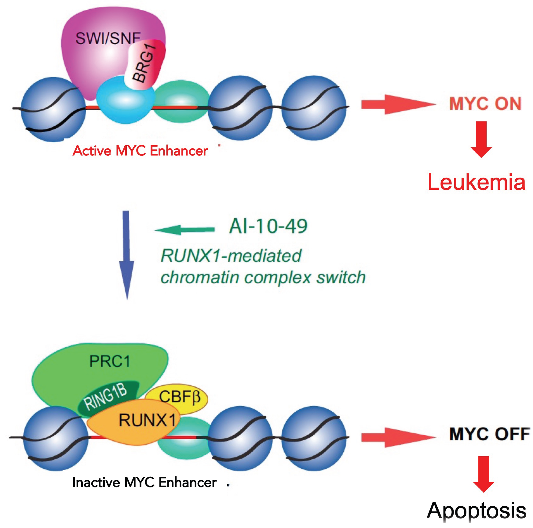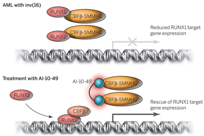 We have shown that AI-10-49, a small molecule inhibitor, successfully hinders CBFß-SMMHC/RUNX1 binding and represses MYC expression, inducing apoptosis of inv(16) AML cells and delaying leukemia in vivo (Illendula et al., Science 2015). Mechanistically, we demonstrated that the inhibitor interferes with SWI/SNF activating complexes at downstream enhancers by enabling the formation of a RUNX1/PRC1 repressive complex, which displaces the SWI/SNF complex and hinders MYC expression (Pulikkan et al., Cell 2018). Can we move AI-10-49 to the clinic? Our laboratory is combining genetic, pharmacologic, and biochemical approaches in cells and mouse models to develop a preclinical system for AI-10-49 delivery, as well as study its effects in combination with other drugs. |