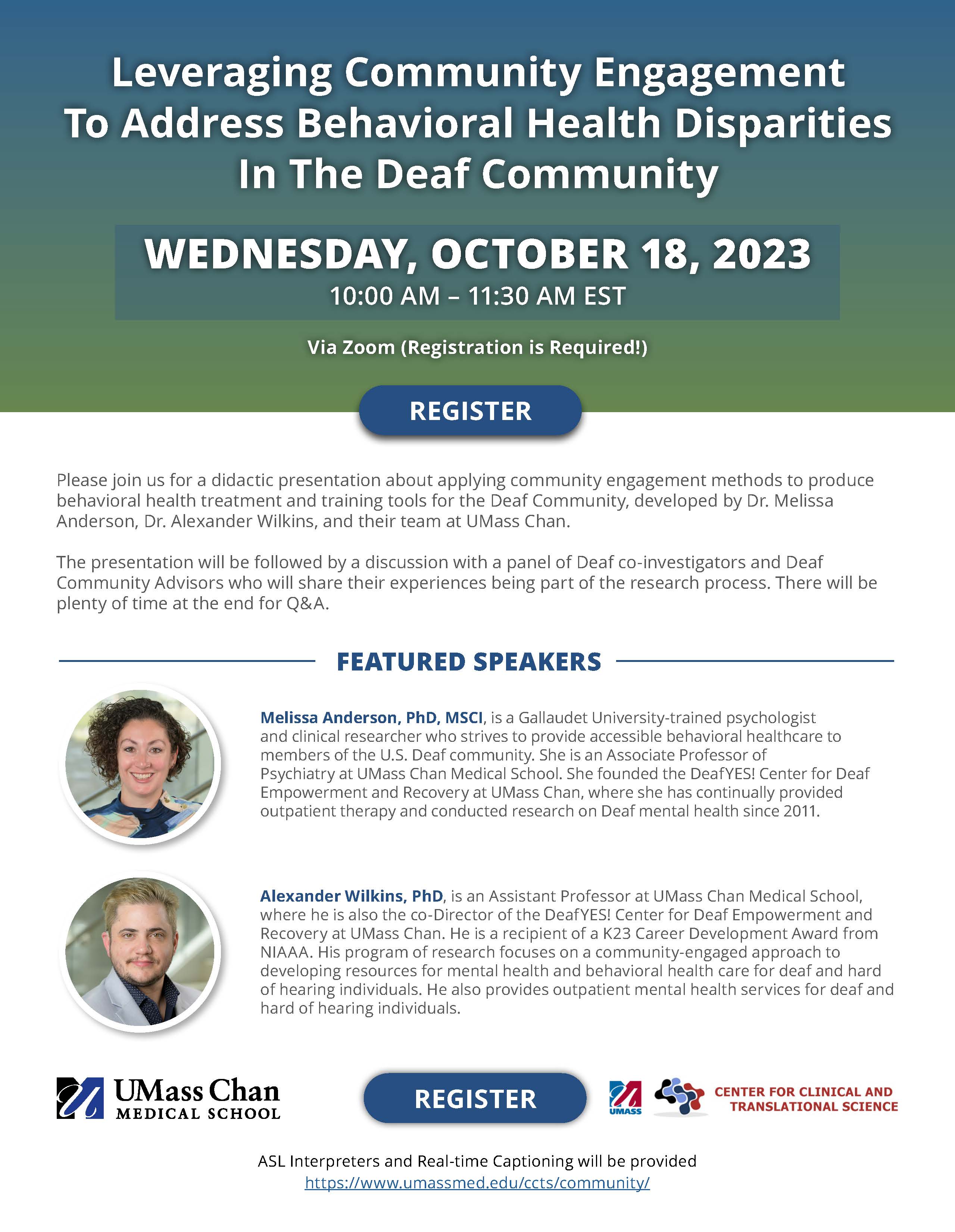 Leveraging Community Engagement To Address Behavioral Health Disparities In The Deaf Community Virtual 10:00 AM - 11:30 AMEvent Description