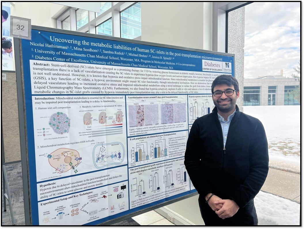 The Spinelli lab is investigating ways to reprogram mitochondrial pathways to avoid hypoxia and improve outcomes for people with type 1 diabetes receiving transplanted insulin-producing stem cell-derived islets as a therapeutic cure. These studies are being led by Nicolai Hathiramani, a PhD Candidate who works in both the Spinelli lab and the Brehm laboratory in the Diabetes Center of Excellence.
