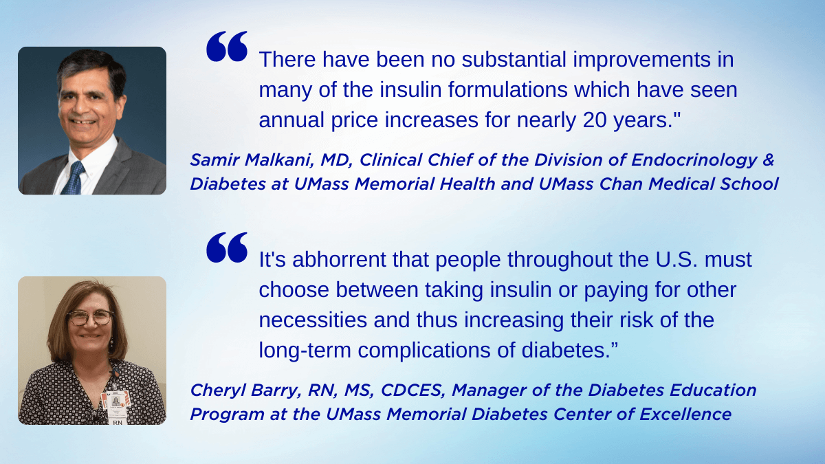 According to Cheryl Barry, RN, MS, CDCES, Manager of the Diabetes Education Program at the UMass DCOE, "For so many people with diabetes, insulin is not an option but is essential to live. It's abhorrent that people throughout the United States must choose between taking their insulin or paying for other necessities and thus increasing their risk of the long-term complications of diabetes.”