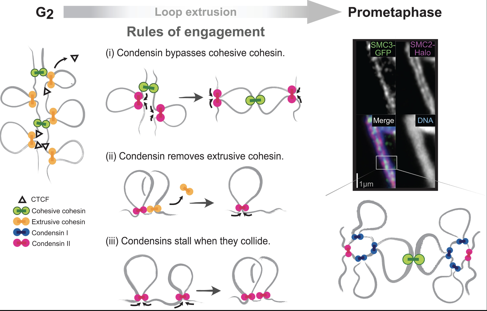 Rules of engagement for condensins and cohesins guide mitotic chromosome formation |