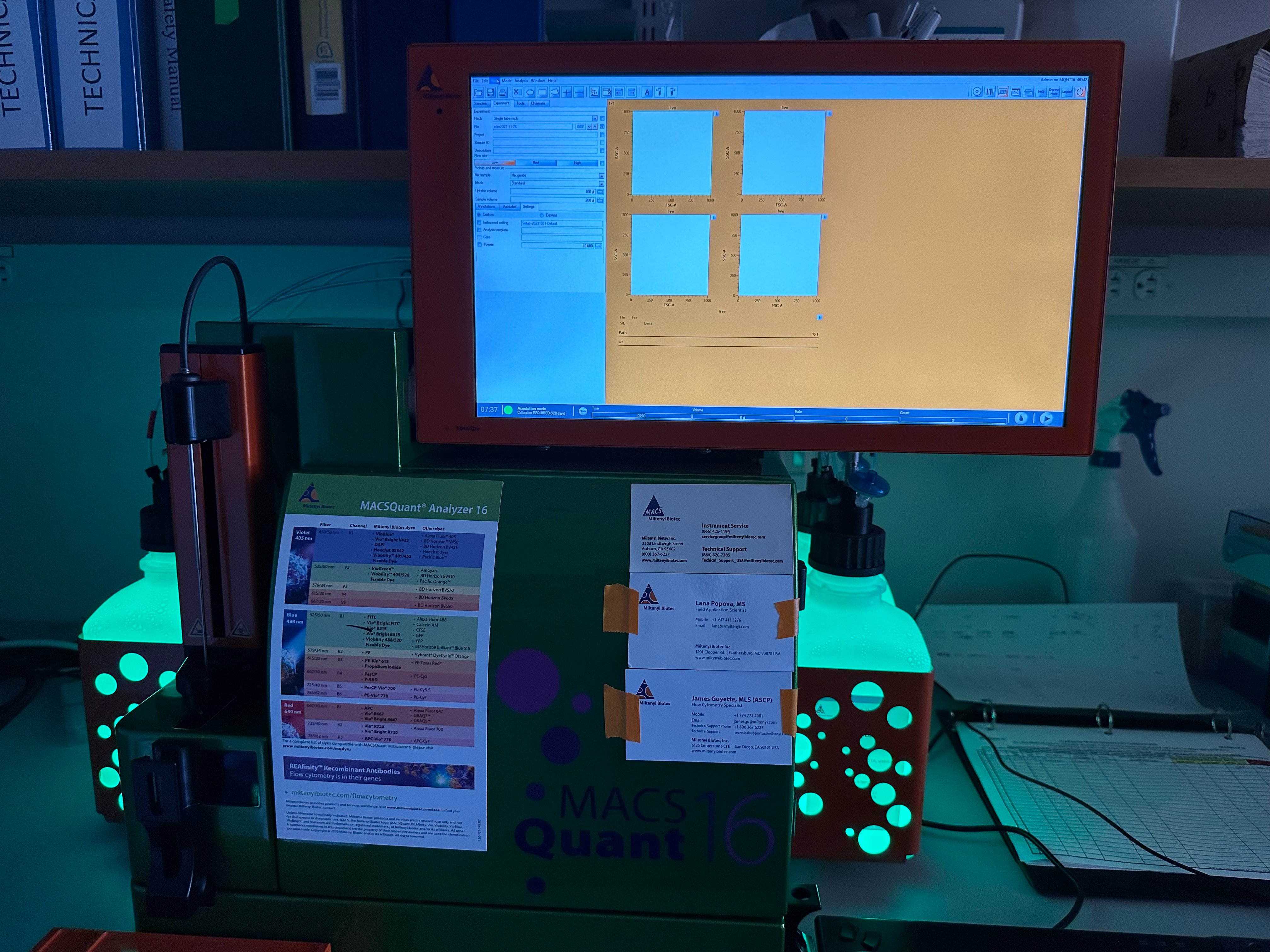 The Miltenyi MACSQuant 16 located in the Albert Sherman Center has a user-friendly interface and a plate sample loader. Equipped with three lasers (405, 488, 640 nm), two scatter (FSC, SSC) and 14 fluorescent channels. The MACS MiniSampler holds tube racks of numerous formats and microtiter plates. The MACSQuant 16 is dedicated to self-use after a brief training class. Contact the flow core for details at 6-3276.