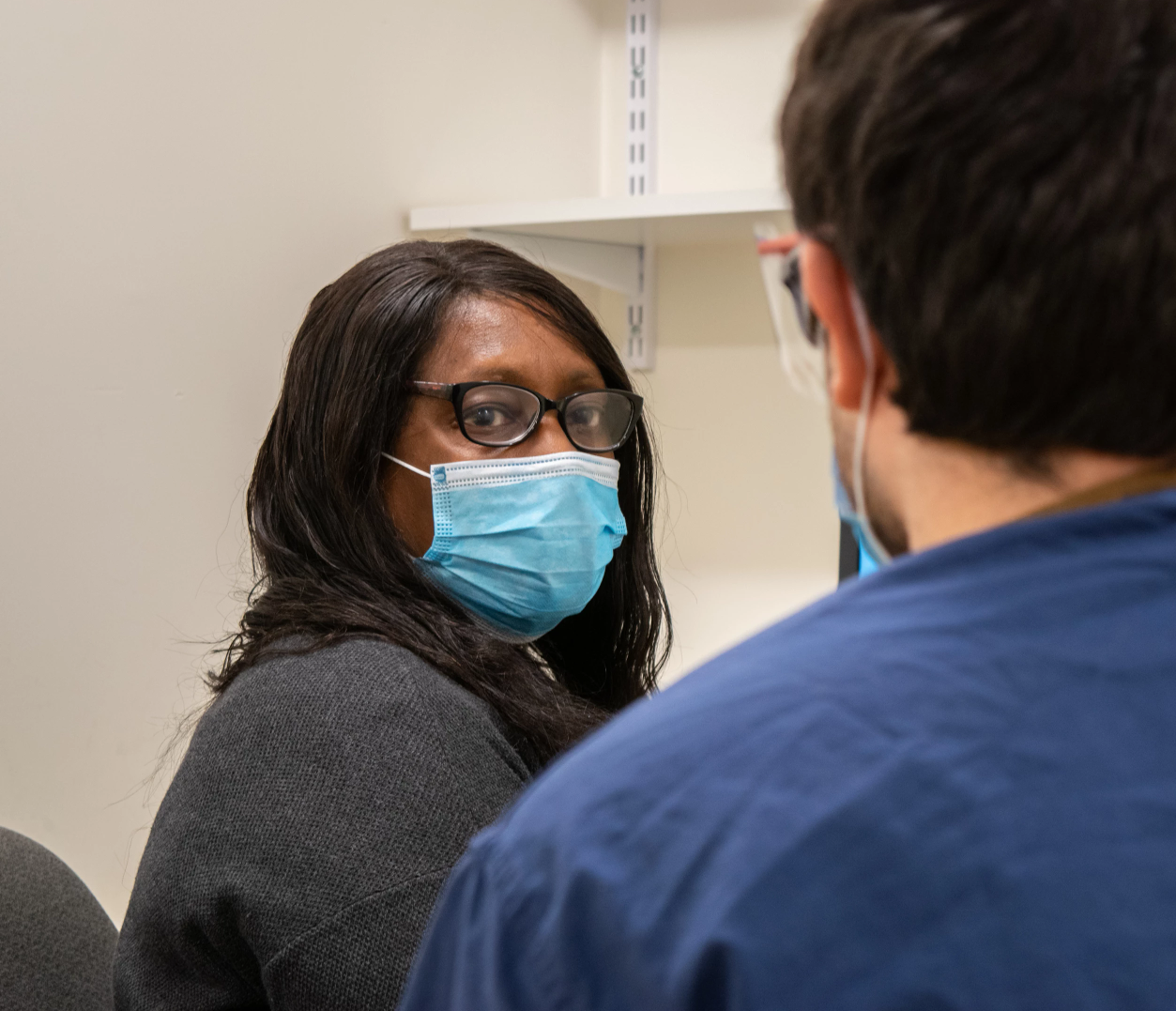 Josephine Fowler, MD, MSc, family medicine attending and vice chair of clinical services for the Department of Family Medicine & Community Health, precepting 2020 grad Jorge Finke, MD. Photo by An-Hoa Giang, MD, for the Workers of Worcester project. Read Josephine’s story here.