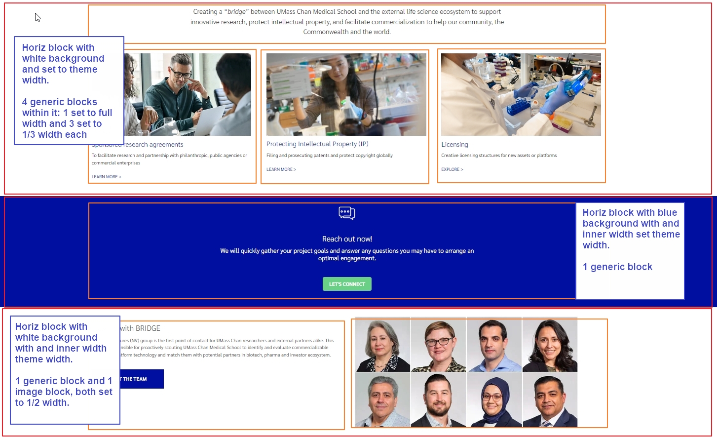 This block is a container for other blocks which allows you to set a background color that extends the full width of the browser. This can be used to help break up the layout and highlight your information. While this block has no text areas itself, you drop other blocks within it. You can drop 1 or many and set the columns widths on each block. You can also set the width of the block area to extend the full width, the theme width as to align with other content on the page, or a width that you can set. Some examples are shown farther below.