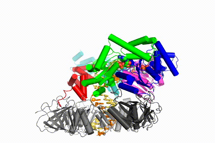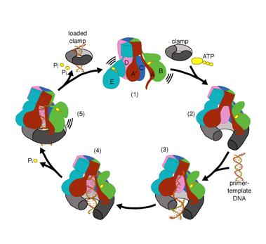 We want to understand the function and mechanism of clamp loaders in atomic detail. Recent structures of the T4 bacteriophage clamp loader in complex with primer-template DNA and the sliding clamp have suggested a working model for the clamp loader mechanism as shown below (see Kelch et al Science 2011):