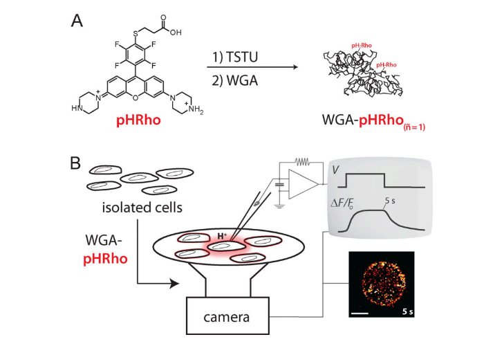 Wheat germ agglutinin-conjugated fluorescent pH sensors for visualizing proton fluxes.