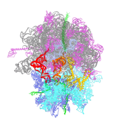 Translation termination is a crucial step in the translation cycle, defining the lengths of all cellular proteins. We'd like to understand how the accuracy of translation termination is achieved, preventing accumulation of prematurely released proteins, which can be toxic to the living cell. Also, we study how termination is regulated, for example by pseudouridylation of mRNA (Svidritskiy et al. "Structural Basis for Translation Termination on a Pseudouridylated Stop Codon". J. Mol. Biol. 2016). At the end of protein synthesis, release factor RF1 or RF2 (RF2 shown in yellow) binds to the bacterial 70S ribosome in response to a termination signal encoded in a messenger RNA (green) located on the small 30S ribosomal subunit (cyan and blue). RF2 is positioned to catalyze the hydrolysis of a peptidyl-tRNA (green and orange) on the large 50S subunit (grey, light purple and magenta). An E-site-bound tRNA is in red. Reviewed in Korostelev AA. "Structural aspects of translation termination on the ribosome". RNA. 2011 Aug;17(8):1409-21.