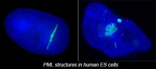 The complex nuclear structure of somatic cells is a key component of epigenomic regulation, yet little is known about nuclear structure and genomic organization of pluripotent cells (e.g. hESC). Here we surveyed several nuclear structures in pluripotent and transitioning hESC. We find hESC have unique nuclear organization and lack numerous defined structural compartments seen in somatic cells. They also exhibit dramatically different PML-defined structures, which in somatic cells are linked to gene regulation and cancer.