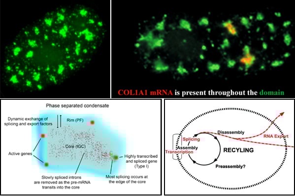 Nuclear speckles, also referred to as SC-35 domains, are nuclear structures that are enriched with factors involved in transcription, RNA processing and export, as well as ncRNAS such snRNAs and the lncRNA MALAT1 (also called NEAT2). Specific genes localize at the edge of speckles, and the concept that they are hubs for transcription, mRNA processing and export has been suggested by our lab since the mid-1990s. Now, genome wide studies have found that active genes throughout the genome associate with speckles. Speckles (top left image) are membraneless condensates that facilitate expression of associated genes through increased concentration and dynamic exchange of factors involved in mRNA metabolism. Top right image: Some speckles have Col1A1 RNA throutout them. Lower left model: Many active genes (red) position in the rim (blue region), which corresponds to perichromatin fibril (PF) ultrastructures, where transcription occurs, but are adjacent to the speckle core (corresponding to interchromatin granule cluster (IGC) ultrastructures), which contains transcription, splicing and export factors. All or almost all introns (green) are removed within the periphery at or near the gene, while some introns can be such as slow splicing introns of COL1A1 mRNA (punctate red signals) distribute throughout the core. Highly expressed, intron-rich genes such as Col1A1 always associate with speckles and their nascent mRNAs can be found within the speckle. We propose that these high demand genes nucleate formation of speckles with which other genes then associate to facilitate their own expression.Lower right: Model suggesting a functional rationale for coupling the completion of mRNA maturation and release for mRNA export with the recycling/preassembly of factors within speckles. Since pre-mRNA processing requires interaction of many different factors, their concentration in condensates would facilitate recycling and reuse for expression of adjacent genes. Selected Lawrence lab publications about SC-35 speckles: Molecular anatomy of a speckle. Anat Rec A Discov Mol Cell Evol Biol. 2006 Jul;288(7):664-75. A three-dimensional view of precursor messenger RNA metabolism within the mammalian nucleus. Science. 1993 Feb 26;259(5099):1330-5. |