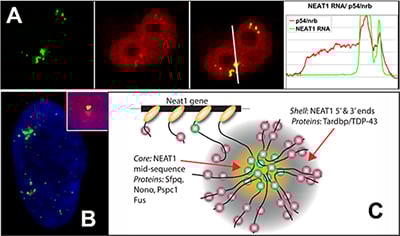 NEAT1 RNA is a noncoding RNA that strictly localizes in paraspeckles, ubiquitous nuclear structures (~10-30/nucleus) which abut the larger nuclear speckles, and provides the essential architectural scaffold for their formation. Paraspeckles can be found in all human primary and transformed cells and are enriched for over 40 different RNA binding proteins, such as PSP1. Paraspeckles are thought to sequester nuclear-retained RNAs and proteins involved in gene regulation or pri-miRNA processing.