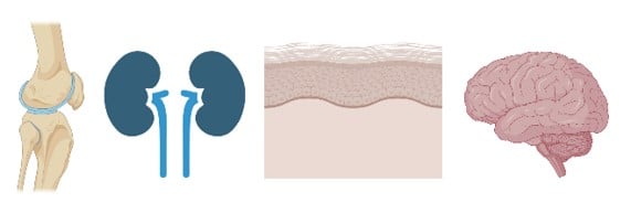Systemic Lupus Erythematosus (SLE) can damage various organs over time, such as the joints, kidney, skin, and brain. Created with BioRender.com.