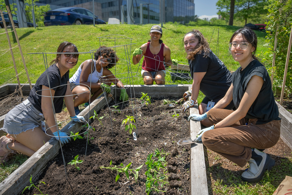 Medical students Dalena Huynh, Elizabeth Johnson, Neha Kamireddi, Celine Cano-Ruiz and Melanie Fu dig in to the 2024 community garden, a project conceived and maintained by students on the Worcester campus.