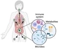 We investigate how intestinal immune populations integrate signals from the microbiota and communicate with other cell populations and microbial metabolites at distal tissues.