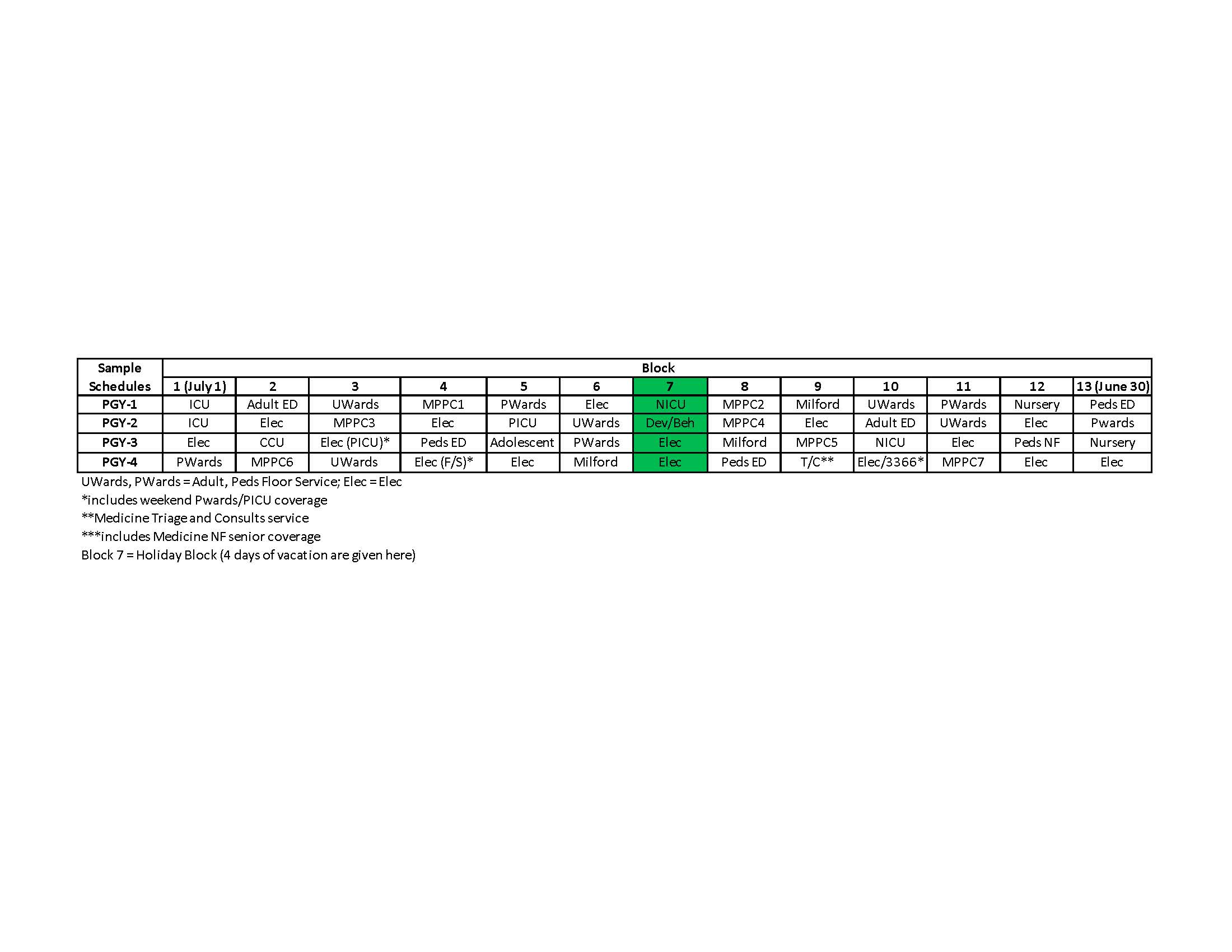Schedule: The academic year is divided into thirteen 4-week blocks, divided between Medicine and Pediatrics. The PGY-1 schedule is pre-set to provide alternating Medicine and Pediatrics rotations (switching every 3 months) over the course of the year. In subsequent years, residents have the flexibility to design their own schedules so long as they adhere to ACGME requirements. A general curricular overview is above in addition to sample resident schedules.