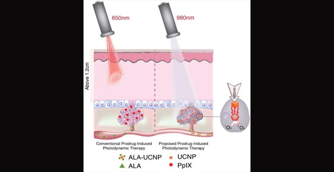 In research published online by the journal ACS Nano of the American Chemical Society, Han and colleagues describe a novel strategy that makes use of a new class of upconverting nanoparticles (UCNPs), a billionth of a meter in size, which can act as a kind of relay station. These UCNPs are administered along with the photodynamic drug and convert deep penetrating near-infrared light into the visible red light that is needed in photodynamic therapies to activate the cancer-killing drug.