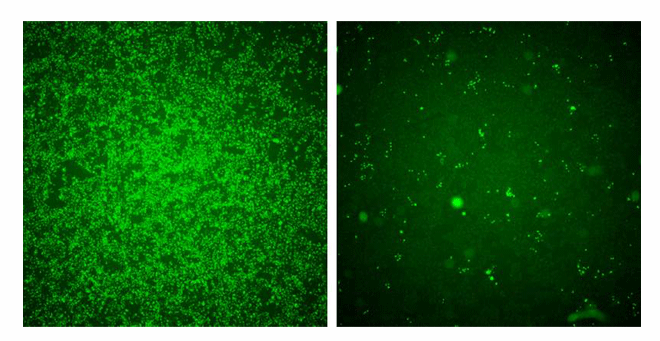 When human cells are exposed to Zika virus, they are overwhelmingly infected, as seen by the large number of green cells (left panel). When IFITM3 levels were boosted in these cells, the virus was prevented from replicating (right panel). |