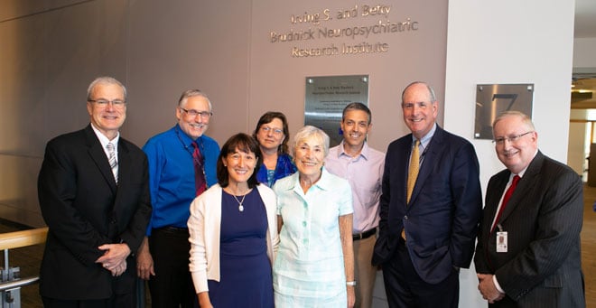 The Irving S. and Betty Brudnick Neuropsychiatric Research Institute at UMass Medical School, focused on the comprehensive study of the brain and behavior, was recently rededicated after being relocated to the Aaron Lazare Medical Research Building. The institute, which opened 18 years ago thanks to the generosity of Betty and the late Irving S. Brudnick, provides scientists with a state-of-the-art laboratory for investigating the nature and causes of mental illnesses. Recently, the Brudnick family helped to establish the Brudnick Translational Fellowship in Mood Disorders to prepare physician-scientists for independent careers in translational neuroscience research. The Brudnick family also endowed the Irving S. and Betty Brudnick Chair in Psychiatry held by Anthony Rothschild, MD. Shown here in the new location of the institute are: (front row, from left) Amy Brudnick Cerel and Betty Brudnick; (back row, from left) Terence R. Flotte, the Celia and Isaac Haidak Professor of Medical Education, executive deputy chancellor, provost and dean of the School of Medicine; Sheldon Benjamin, MD, interim chair and professor of psychiatry; Vivian Budnik, PhD, chair and professor of neurobiology ; Andrew Tapper, PhD, professor of neurobiology and director of the Brudnick Neuropsychiatric Research Institute; Chancellor Michael F. Collins; and Dr. Rothschild, professor of psychiatry.