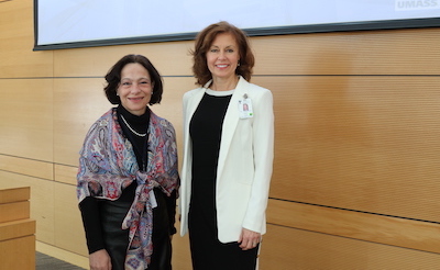 MD/PhD Program co-director Silvia Corvera, MD, (left) and director Gyongyi Szabo, MD, PhD, are pictured at the 14th annual Physician Scientist Research Retreat. |