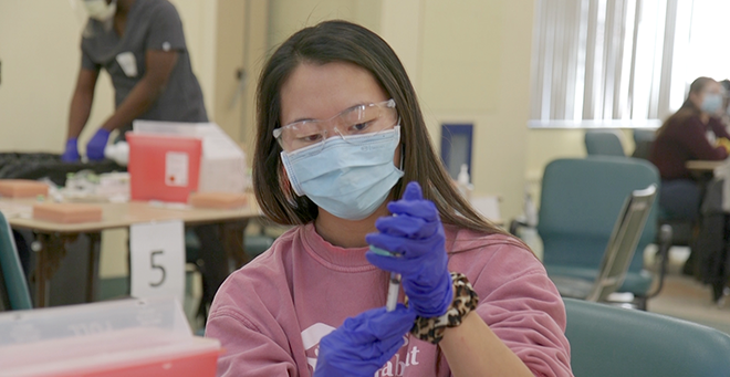 UMass Medical School students are trained and ready to administer COVID-19 vaccinations to Worcester-area residents. Thirteen Graduate School of Nursing students taught more than 150 School of Medicine students to give the intramuscular injections. Graduate School of Biomedical Sciences students will help track participants.
