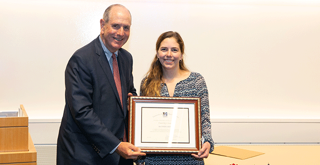 Although most of the winners were announced ahead of time, the winners of the Chancellor’s Award and the Dean’s Awards for Outstanding Research were announced at the event. Chancellor Michael F. Collins presented the 2021 Chancellor’s Award to Heather Loring for her outstanding research and leadership, saying that her discovery of novel mechanistic insights may lead to the development of novel therapies for cancer and neurogeneration. GSBS Dean Mary Ellen Lane honored Zachary Milstone and Erica Mondo, participating in the event via Zoom, for their thesis research.