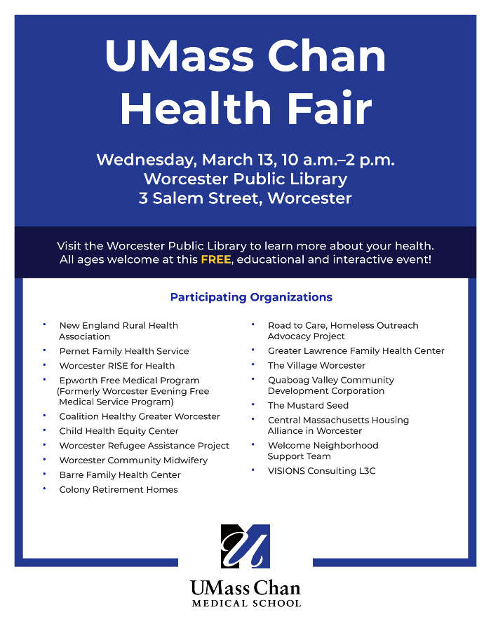 The students’ service hours will culminate at a community health fair at the Worcester Public Library on March 13 from 10 a.m. to 2 p.m. The event is hosted by UMass Chan. Groups of first-year students will work with their community partners to staff a table at the fair and provide a variety of basic health services to the community.