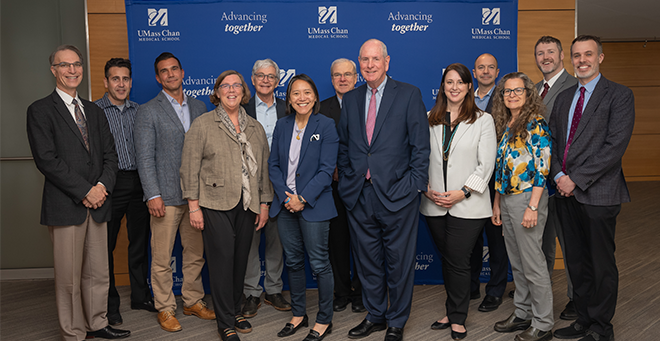 Massachusetts Secretary of Economic Development Yvonne Hao announced a $555,000 grant from the Massachusetts Technology Collaborative to UMass Chan on April 10, to be matched with $137,000 private investment, for the establishment of the Health AI Assurance Laboratory, in partnership with MITRE and the Coalition for Health AI. Pictured at the announcement, from left to right: Francis Campion, MITRE; Ozgur Eris, MITRE; Brian Anderson, CHAI; Carolyn Kirk, MassTech; Patrick Larkin, MassTech; Secretary Yvonne Hao; Terence R. Flotte, UMass Chan; Michael F. Collins, UMass Chan; Senator Robyn Kennedy; Doug Robbins, MITRE; Melissa Fischer, UMass Chan; Miles Thompson, MITRE; David McManus, UMass Chan.