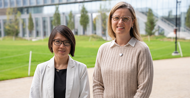 Khanh-Van T. Tran and Brigid M. Carlson standing together outside in front of a green lawn