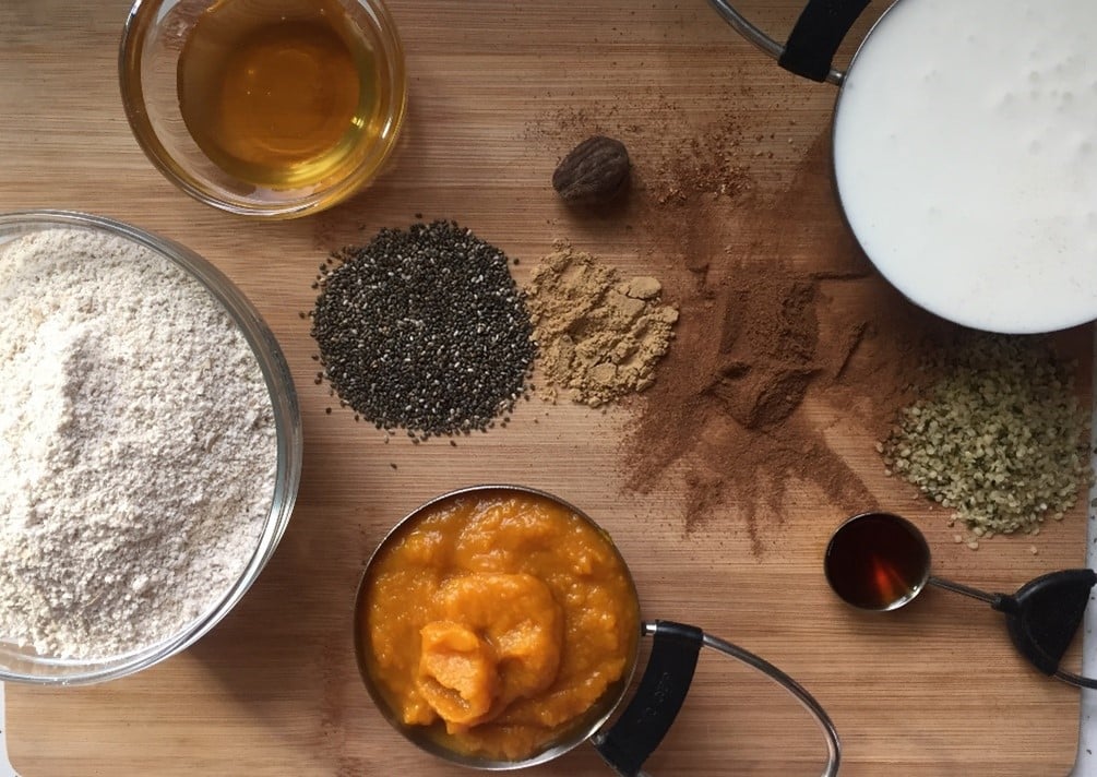 2. Whisk flour, baking powder, baking soda, spices, hemp, and chia seeds in a medium mixing bowl.
