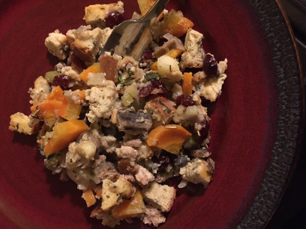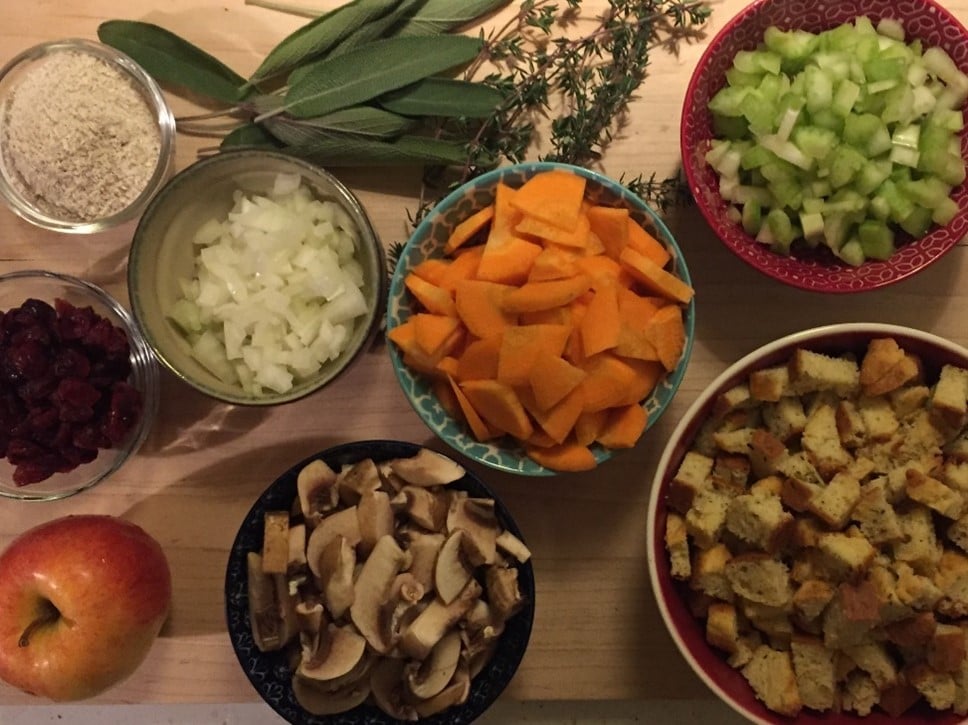 - Heat remaining oil in the same skillet over medium high heat. Add onion, garlic, celery, and mushrooms. Cook ~2-3 minutes or until soft. Add turkey, carrots, seasoning, and flour. Stir to coat, ~ 30 seconds. Add 2 cups broth and cook until thick. Transfer turkey mixture to a baking dish. Top with classic drop biscuits cubes. Whisk eggs and pour over mixture.