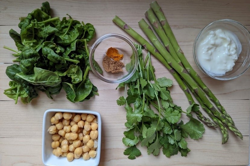 - Add asparagus, cilantro, and spinach to chickpeas.
