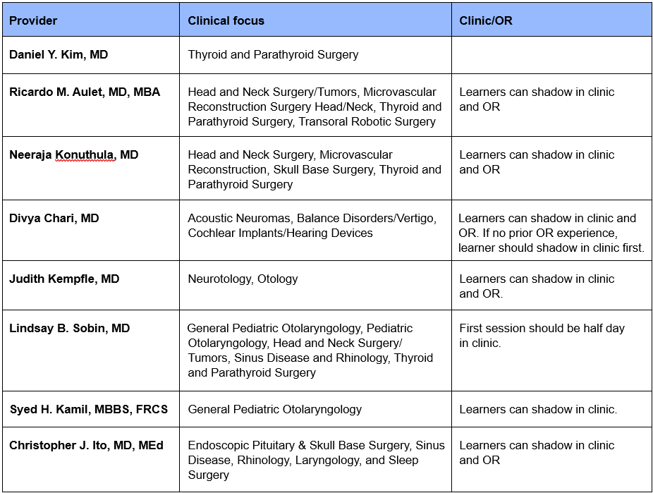 - Figure out who you want to shadow - there is a wide range of subspecialties within ENT, so read up on the different people you can shadow to learn more about them: