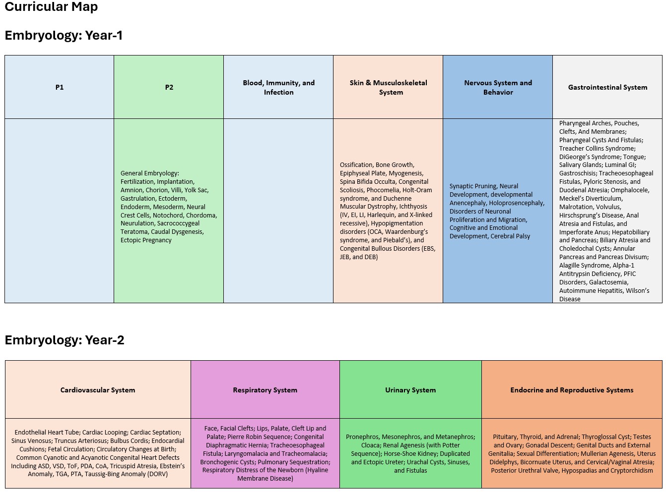 Oversight of the effective coverage, placement, sequencing, and integration of embryology content is provided by a dedicated longitudinal embryology director, whose role is funded by the school. This leadership ensures that embryology content is not only robust and up to date but also aligned with curricular goals and clinical competencies. The director collaborates with system leads and course directors to optimize the delivery and assessment of embryology throughout the curriculum.