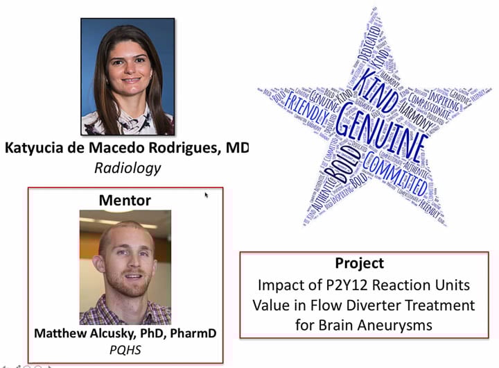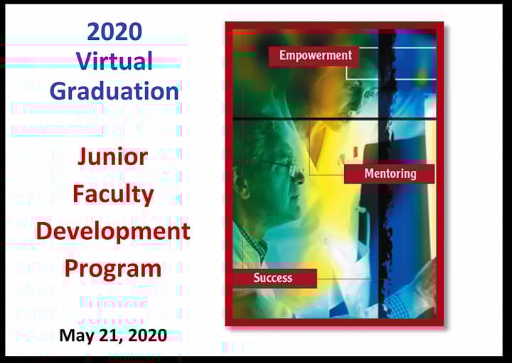 Three Radiology Faculty Members graduated from the Junior Faculty Development Program (JFDP) on May 21 during a virtual ceremony via Zoom. Katyucia de Macedo Rodrigues, MD, Elizabeth Garwood, MD and Alexandra Wink, PhD started the intensive year-long program last fall. The JFDP has two components; an comprehensive curriculum and a project guided by a senior faculty mentor. The individual project is identified by the participant, approved by their chair and completed with the assistance of their mentor. The projects are presented during late May, this year due to the Covid-19 restrictions were presented via Zoom sessions. For the graduation descriptive words were collected for each graduate and a word cloud/star was created and posted during the presentation. Congratulation to our three Radiology graduates!