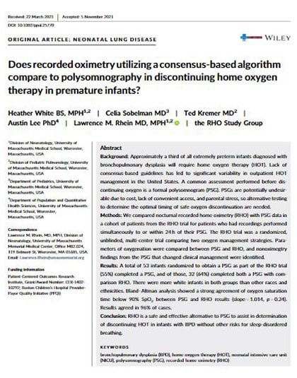 Rhein, Lawrence, et al. “Transmitted Home Oximetry and Duration of Home Oxy-gen in Premature Infants.” American Academy of Pediatrics, American Academy of Pediatrics, 1 Aug. 2020, pediatrics.aappublications.org/content/146/2/e20200079.