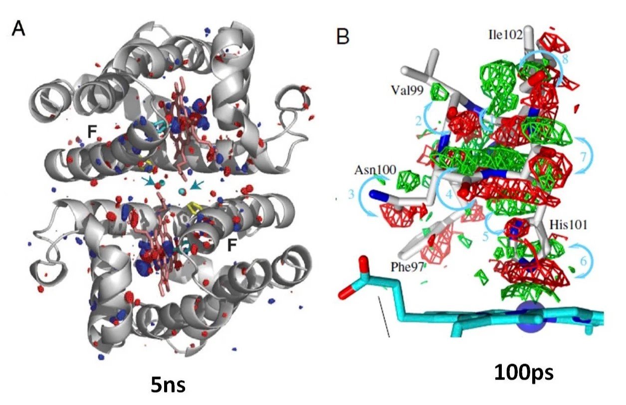 Invertebrate hemoglobins provide a number of useful model systems for exploring how protein subunits communicate. We have investigated systems ranging from the simplest possible allosteric systems to much more complex protein assemblages. As part of our efforts, we determined crystal structures of respiratory proteins with molecular masses of 3.6 x 106 Da comprising 180 different subunits. (Our crystal structure of Lumbricus erythrocruorin was highlighted as the March, 2013 molecule of the month at the protein data bank.) Our current efforts are focused on applying sub-ns time-resolved crystallographic analysis to a dimeric hemoglobin (Scapharca HbI) to dissect the time-dependent ligand-linked structural changes that underlie cooperative ligand binding. These experiments are being carried out at BioCARS (Advanced Photon Source) in collaboration with Dr. Vukica Srajer and Dr. Zhong Ren. They have already led to a new understanding of the role of water molecules in intersubunit communication as well as permitting the development of a novel dynamic model that incorporates a direct linkage between two active sites. In collaboration with Dr. Francesca Massi (BMB), we are combining the crystallographic results with NMR experiments that investigate the role of interface dynamics in cooperative behavior.