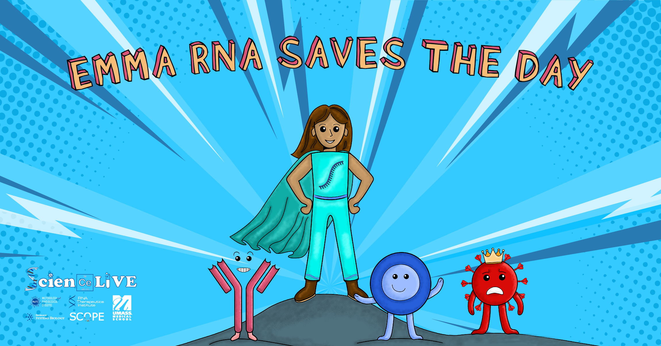 To help give children and parents a better understanding of the science of the mRNA vaccines, ScienceLIVE and the RTI at UMass Chan created this coloring & comic book resource just for kids! We hope parents and teachers can use it to help explain this complex situation, while also teaching the wonders of science. We have freely downloadable pages in English, Español, 中文 (Chinese), Deutsche, Français, हिंदी (Hindi), Português, Türk, and Tiếng Việt to print as well as a classroom request form for teachers, librarians, and pediatrician's offices to request hardcopies of the coloring books. More languages to come!