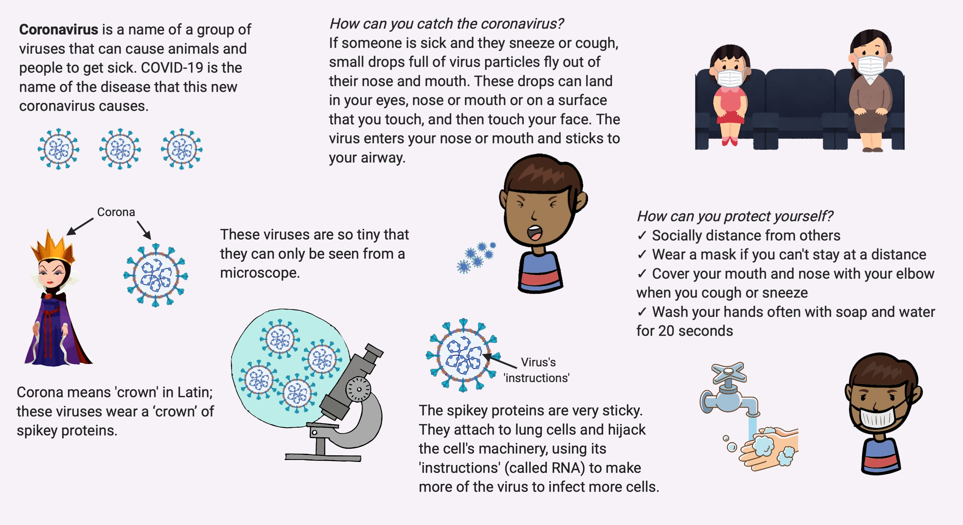 Coronavirus infographic explaining coronaviruses, how COVID-19 can spread, and how to protect yourself, for kids!