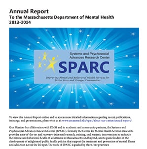 We are grateful to the Massachusetts Department of Mental Health for its continued support of the University of Massachusetts Medical School’s (UMMS) DMH Research Center of Excellence, the Systems and Psychosocial Advances Research Center (SPARC) (formerly the Center for Mental Health Services Research [CMHSR]). We continue to leverage the DMH investment to support innovative, recovery-oriented, state-of-the-art psychosocial and systems research. Highlights of Fiscal Year 2014 include an increase in research dollars awarded through new grants and contracts, and continuation of our three-year Strategic Plan to guide our growth and trajectory over the coming years.