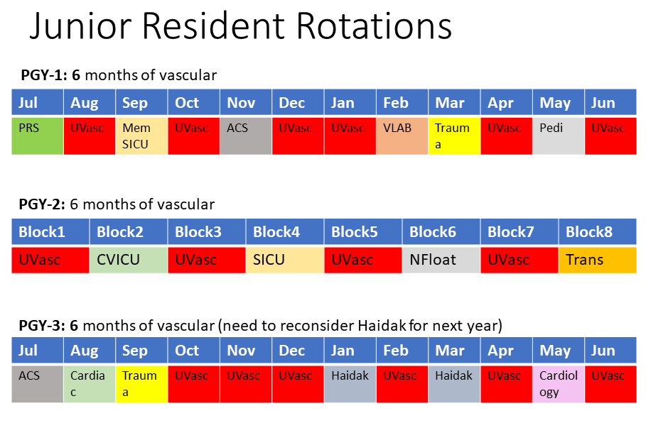 The five years of training is divided into three years of integrated training in general and subspecialty surgical rotations, cardiology/CCU, and noninvasive vascular lab training, with the final two years dedicated exclusively to vascular and endovascular training. This equates to 24 months of core integrated training and 36 months of vascular training.